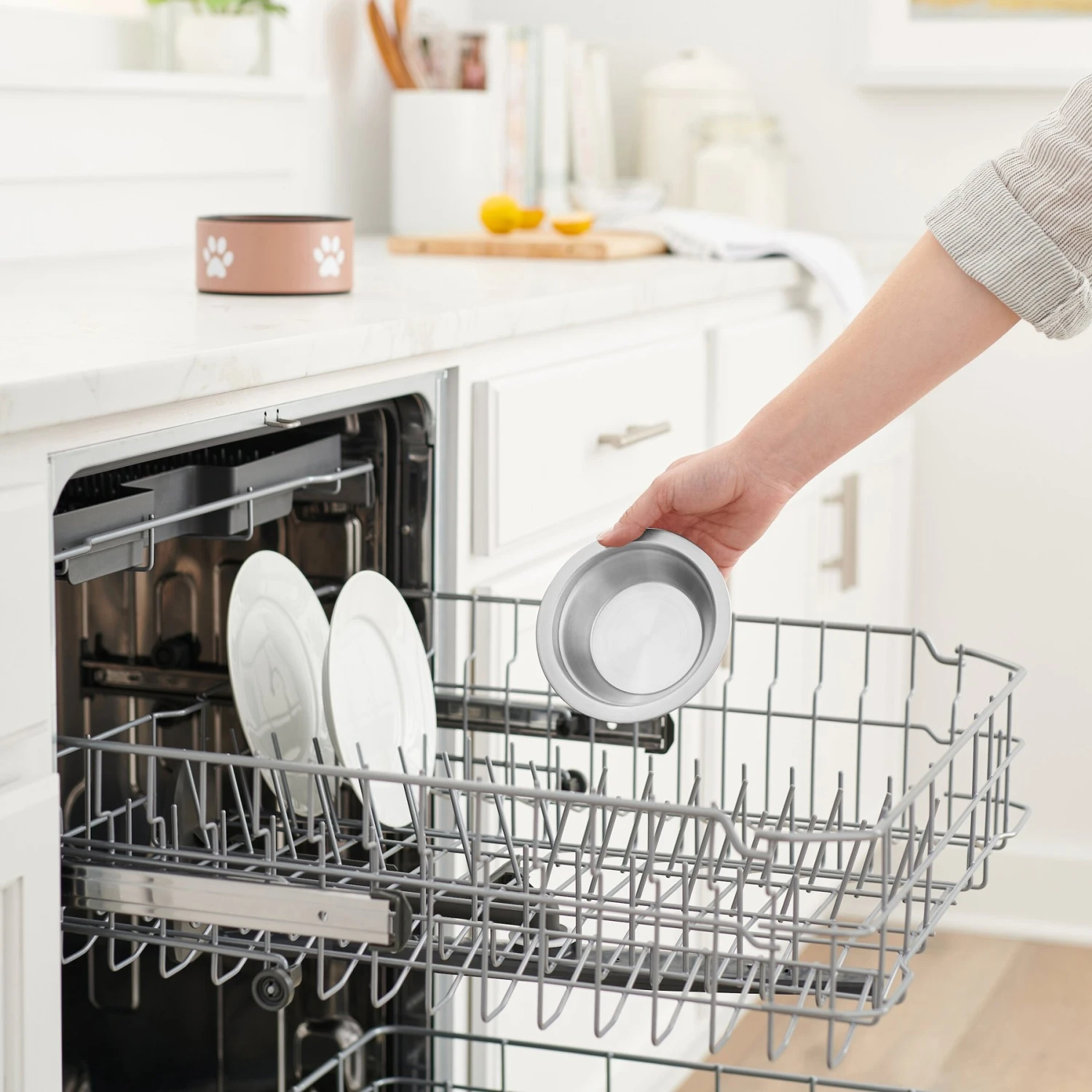 Elevate your pet’s dining experience. This bowl has a raised design so your pup and kitty can eat and drink from new heights. Made of durable stainless steel, it’s the perfect bowl for everyday use. It has a shallow and wide design that’s easy for your pet to access. The bowl sits on a rubber ring for quiet eating and drinking, and the base is nonskid so the bowl stays in place. A paw print adds just the touch of style you need. Hand wash it or toss it in the dishwasher for easy cleaning.